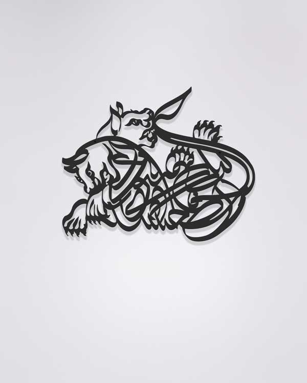 Ruheel takes a similar approach to his designs that use the idea of the invisible meanings in words as the basis of his zoomorphic structures. These words inscribed are not meant to uphold religious sentimental values but expose words that are often whispered under one’s breath sarcastically in the common vernacular. At first glance, the script inscribed within the animals in the zoomorphic designs seemingly fulfils a decorative purpose, such as those found on rock crystal ewers from Fatimid Egypt (10-11th century) 3 Upon closer inspection, each artwork’s title can be located within the script, intricately woven into the contours of the creatures. The zoomorphic designs have been carefully selected based on what purpose they may lend to pictorial representation. Using the Thuluth script—originated during the early Abbasid period in the 7th–9th centuries CE and evolving from the earlier Kufic and Naskh scripts mainly used in inscriptions and mosque decorations,4 —the Urdu translation of each title is seen fluidly integrated into the outline.