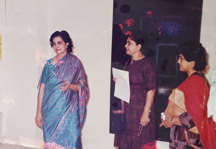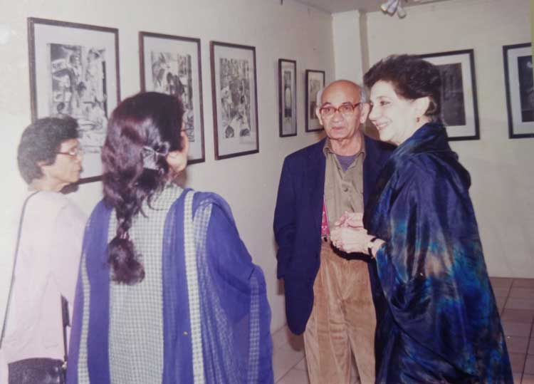 Ali Imam’s Indus Gallery operated out of his home— visitors might catch glimpses of his children doing homework. Zohra Hussain saw this informality as an opportunity. Her gallery was carpeted— a fashionable touch in the 1980s— there was air conditioning and thoughtful lighting. Clifton was less inhabited then, around the gallery “there were no cars or buildings— just kabootar.” People would wander in from the supermarket downstairs while their wives shopped. “I’d take them around and talk about art. They weren’t intimidated by me.” Ever the gracious host, she served coffee and tea all day to visitors who came as much to talk as to see the art. As Niilofur Farrukh recalls, “Zohra Apa would talk to you— she didn’t care if you were a buyer”.