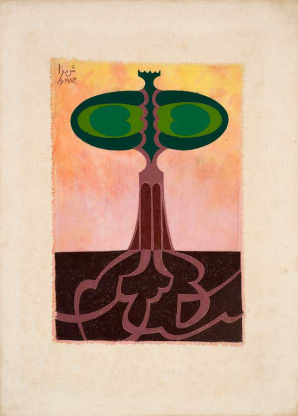 The loss of identity— of feeling unanchored, uprooted— is best reflected through two works of Anwer Shemza, who is flanked by Welsh artist Arthur Giardelli on one side and Muzzamil Ruheel on the other. Shemza’s Untitled modernist piece from the ‘Roots’ Series emerges from his desire to return to Pakistan. A symmetrical painting with a stylised tree at its centre has what appears to be Urdu script disguised as roots on the bottom half of the piece, except the script doesn’t form any words hence it is untranslatable, perhaps signifying the uprootedness felt by the artist, his desire to return to his home country which remained unfulfilled owing to his untimely death.