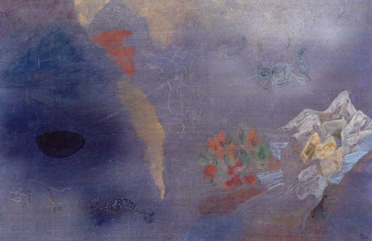Nilima Shaikh’s Territorial Issues similar to her series Each Night Put Kashmir in your Dreams sheds light on the disputed state of Kashmir, a contentious remnant of the Raj, a wound still gaping to this day. On a powdery background in hues of blue, to the bottom right is a landscape of mountains and flowing water, on the opposite end, two animals that seem like Hyena’s composed in fine linework, interact. Flying above the scenic valley to the right, next to a whirlwind cyclone, executed in the same fine line are two mystical creatures bound to each with a single thread connecting their neck and feet. The wild beasts and the rocky terrain point to unresolved conflicts i.e., cultural and territorial divisions.