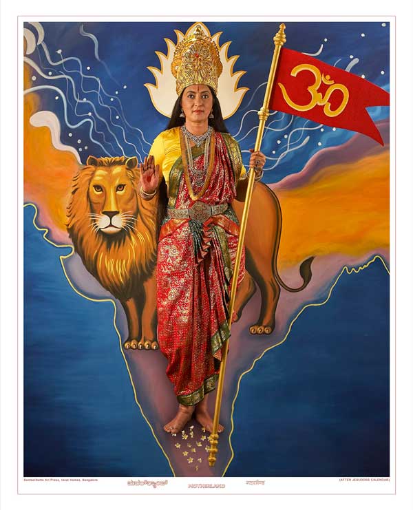 A final concern of this show elucidates a contemporary outlook considering women as synonymous with nations, presented under the theme of Myths of Nation: Wo(Men) & Mothers. Jumabhoy has juxtaposed the notion of Mother India with Mother Wales, another similarity between the two distinct and disparate geographical nations. Amongst other works, this is exemplified through Pushpamala N’s satirical piece Mother India, a giclee print appropriating commercial political photography titled Motherland, part of her Mother India Series (2014-2018). The work was ‘motivated by the ascendance of the Hindu Right and its manipulation of nationalist iconography’2. Pushpamala states she was “interested in looking at the history of ‘Mother India’ with the rise of fascism and fundamentalism in India. The Mother India-as-Durga figure was being used in right wing political rallies in a hyper-nationalist way3.
