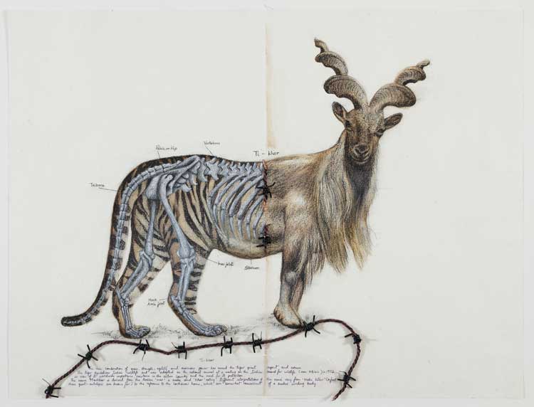 In the same theoretical space, where creatures like tigers and dragons metaphorically lock horns to compete, is Indian artist Reena Saini Kallat’s work which critiques the notion of symbols, marking territory through national emblems. She comments on shared history and loss through her work Hyphenated Lives (Ti-khor) portraying national symbols as hybrid forms. ‘Ti-khor is part of a series, a fusion of the tiger and markhor goat, the national animals of India and Pakistan. Though national symbols were meant to unite people from a region, they often become sources of contention as nations attempt to monopolise natural forms that don’t belong to either side.’ 1