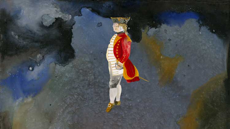 Displayed in the same space is a historic portrait of Robert Clive, borrowed from Powis Castle and an animation titled The Last Post by Shahzia Sikandar that portrays a caricature of Clive (or a company official) intruding/occupying a Mughal darbar before combusting into bits against a dark inky background in the final frame.
